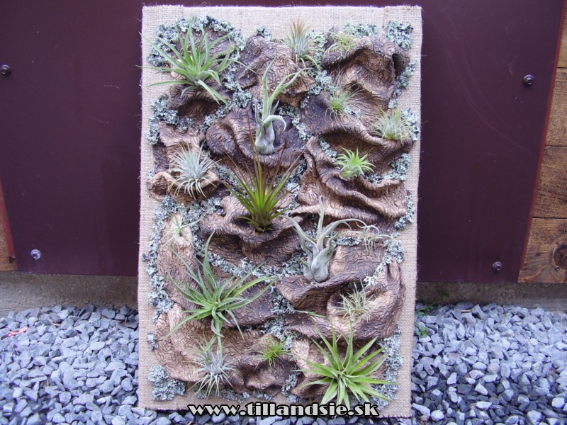 Ja sa zaoberám pestovaním a aranžovaním tillandsií,preto som sa rozhodol vytvárať vertikálne záhradky práve z týchto rastlín,a nazval som ich ,,živé obrazy z tillandsií,,.Takéto obrazy môžu byť od jari do jesene umiestnené aj von,ale v zime musia byť vo vnútri.Tí,čo poznajú a pestujú tillandsie vedia,že sú to rastlinky čo sa týka údržby nenáročné,rastú veľmi pomaly ,pekne kvitnú a po odkvitnutí sa rozmnožia.Potrebujú akurát dostatok svetla a dvakrát do týždňa orosiť mäkkou vodou.Pre tých,čo tillandsie ešte nepoznajú,sú to rastliny príjimajúce vodu povrchom listov.Fotky sú v galérii.
